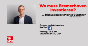 Der Bremerhavener SPD-Vorsitzende Martin Günthner setzt die Reihe der virtuellen Bürgersprechstunde der Seestadt-SPD fort: Am Freitag, 15. Mai, ab 14 Uhr, steht der SPD-Rede und Antwort. Im Mittelpunkt steht der geplante Bremen-Fonds, aber auch weitere Themen können angesprochen werden. Via Facebook Live über die Facebook-Seite der SPD Bremerhaven und telefonisch unter 0471/45082 ist der SPD-Politiker zu erreichen. Zur Vorbereitung ggf. komplexer Fragestellungen wird um vorherige Übermittlung der Fragen per Mail an sprechstunde@spd-bremerhaven.de oder telefonisch das SPD-Parteibüro unter 0471/45082 gebeten. Wichtiger Hinweis: Auch wer keinen Facebook-Account hat, kann die Sprechstunde sehen. Natürlich werden auch Fragen beantwortet, die über die Kommentar-Funktion während der Sprechstunde gestellt werden.