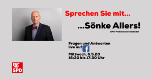 Nach der erfolgreichen Premiere der virtuellen Bürgersprechstunde der Bremerhavener SPD am Montag mit dem heimischen Bundestagsabgeordneten Uwe Schmidt gibt es am Mittwoch, 6. Mai, eine Fortsetzung: Von 16.30 bis 17.30 Uhr steht Sönke Allers, Vorsitzender der SPD-Fraktion in der Bremerhavener Stadtverordnetenversammlung, Rede und Antwort. Via Facebook Live über die Facebook-Seite der SPD Bremerhaven und telefonisch unter 0471/45082 ist der SPD-Politiker zu erreichen. Zur Vorbereitung ggf. komplexer Fragestellungen wird um vorherige Übermittlung der Fragen per Mail an sprechstunde@spd-bremerhaven.de oder telefonisch das SPD-Parteibüro unter 0471/45082 gebeten.